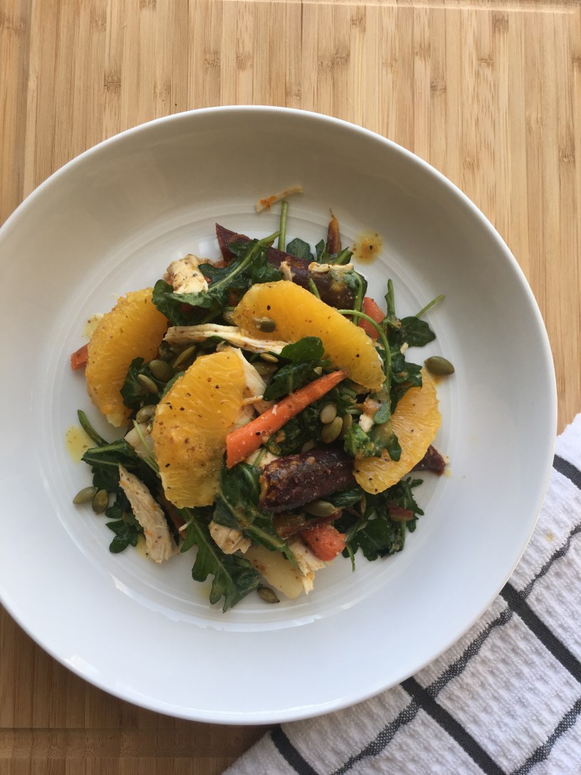 - Toss the roasted carrots, arugula, and chicken (optional) in the orange-dijon vinaigrette